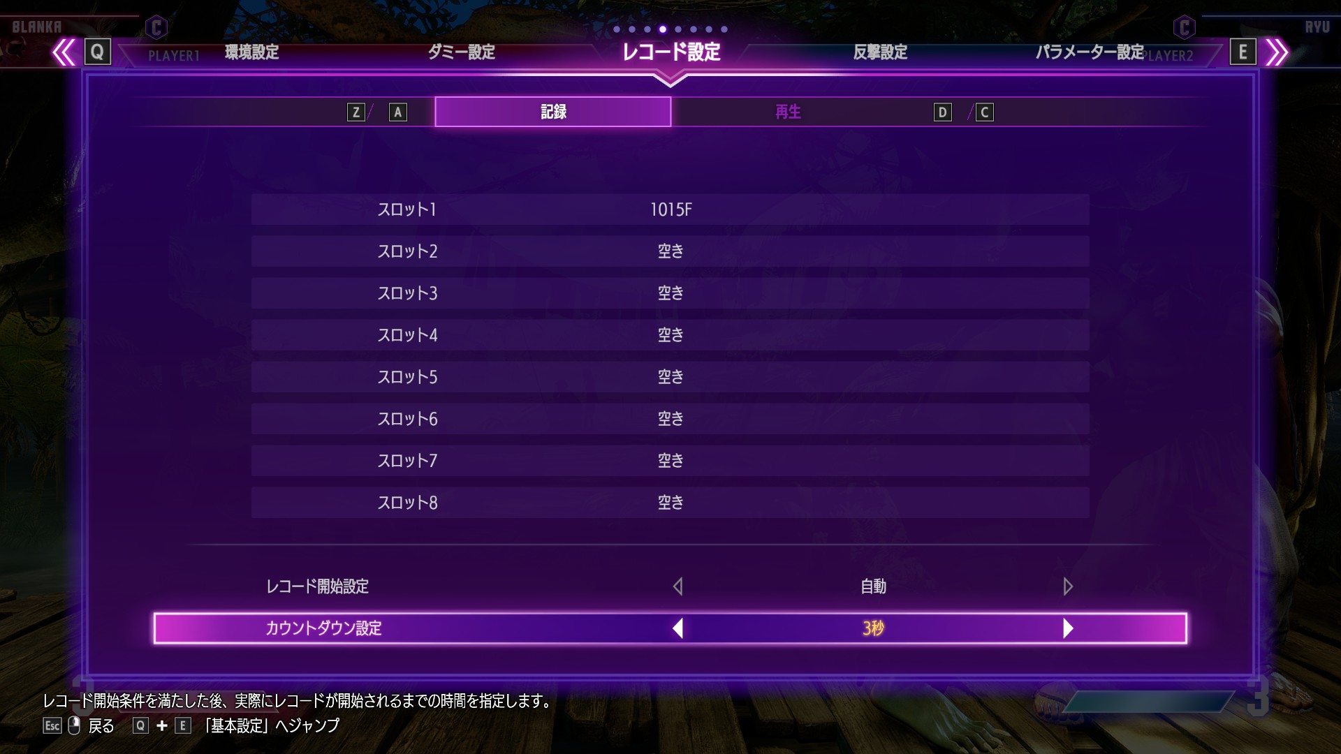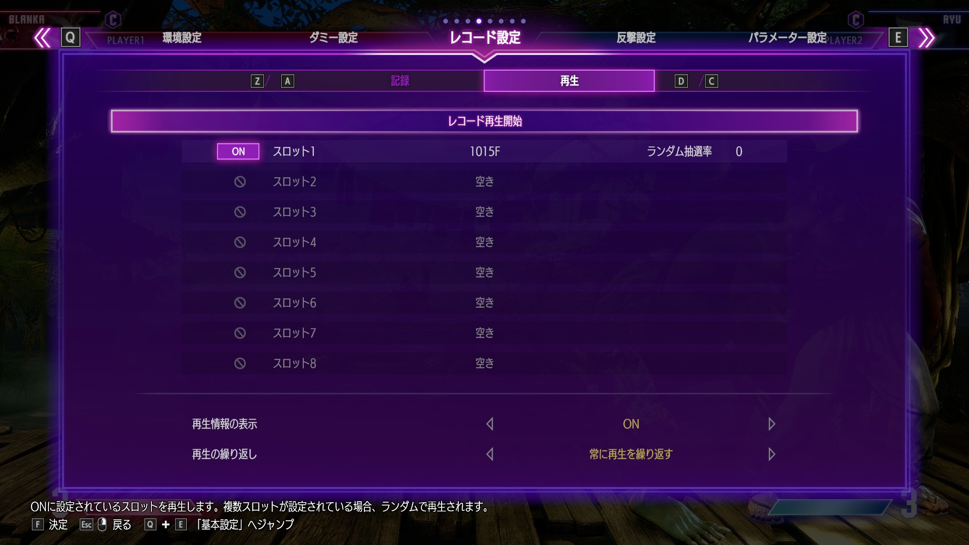 まず録画機能で片方にガードを入れた状態を500フレームほど用意する。その後それを再生する。その後に上に書いたようなコンボを再生中に行えばよいのだ。ダウンリバーサル・ガードリバーサル・ダメージ復帰リバーサルなどは全く設定しなくていい。あくまで録画と再生で防御の片っぽを記録して疑似人間操作をCOM操作に代わって実装できれば良いのである。そしてその録画記録をループして再生するように設定もできる。