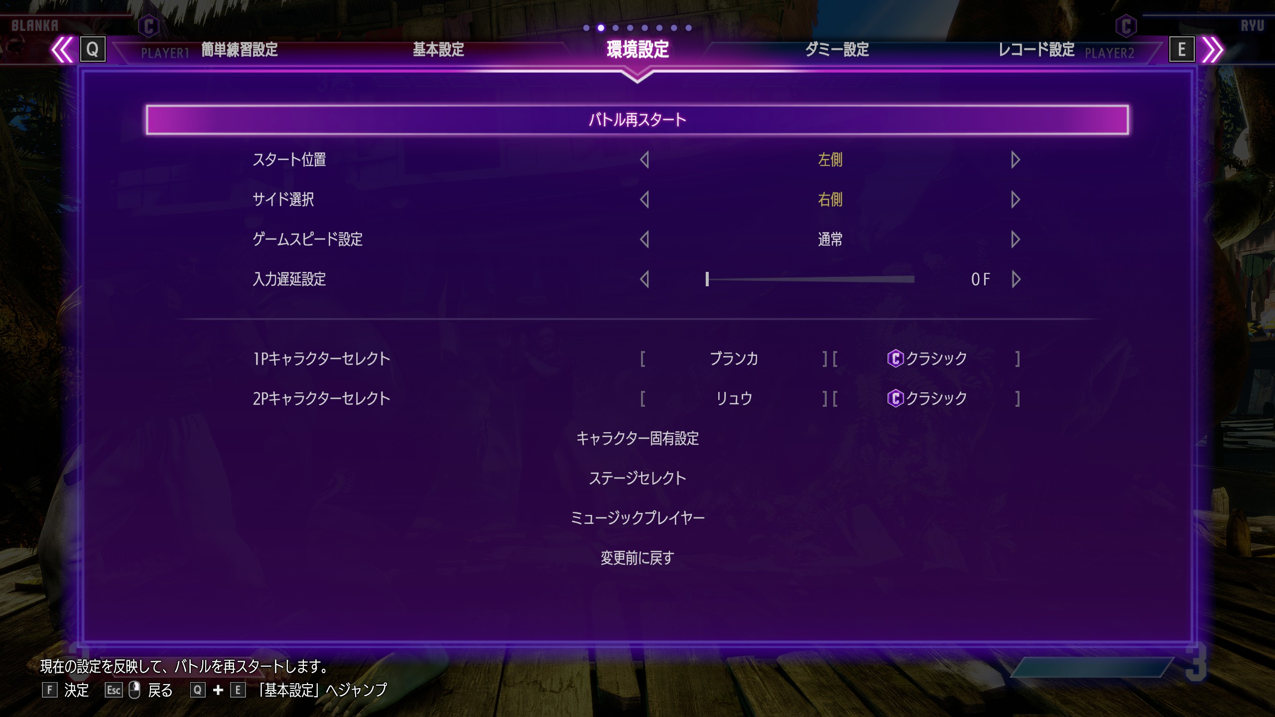 ちなみに左端でキャラ入れ替えもできる。下のような環境設定の画面でスタート位置を左側にしてサイド選択を右側に設定すればよいのである。この環境下でも同じようなコンボが入るのでそいつを解説してこの記事を〆ようか。中段でも同じことが言えるのでそれを再現してみた。上述のコマンドの2中Kの部分が中上段系の攻撃に置き換わっているだけである。