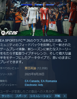 さらには新作が出るたびに「操作」「戦術」「課金」のほぼ全システムがオーバーホールに変容する「EA FC」のことだから継続性がないのがこのゲームの特徴ともいえる。買い切りタイトルでP2W(元タイトルを高額で買ってさらに勝つために課金する必要がある)。これでは批判されて当然だ(とゲヲログは過去記事で述べた通り)。微妙な匙加減でバランスをようやっと取っているからゲームのバランスが崩れると一気に人が離れるリスクも負う。Steam的に言ってもいつでも「賛否両論」なゲームシリーズに成り下がっている。これが現実だ。