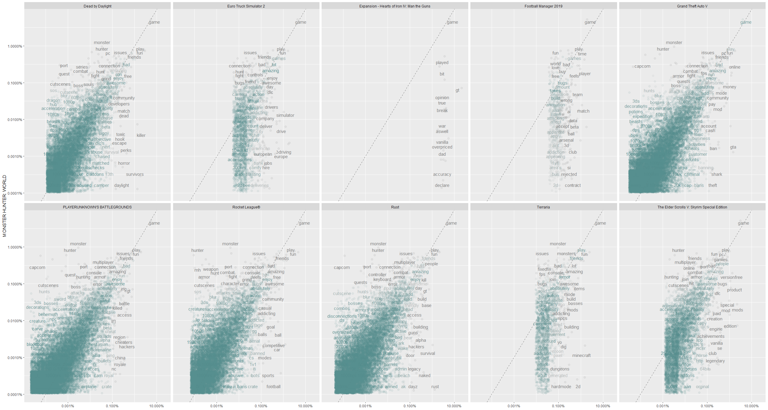 モンハンワールドを基軸として単語がどれだけ相関上離散しているかを表す作図。HOI4は極端にデータが少なかったので統計有意とれるか?っていうのが気になる。あとはトントンだけどシミュレーションゲームとかは離れがち。逆に3Dのコンバットアクションゲームは近い。そこに至るまでの道のりが段々畑のようになっているの観察できる。2Dゲーは中間に位置してるかな。ゲームルールとかシステム的に近しいものは相関も(恐らくは)強いはずなのである。