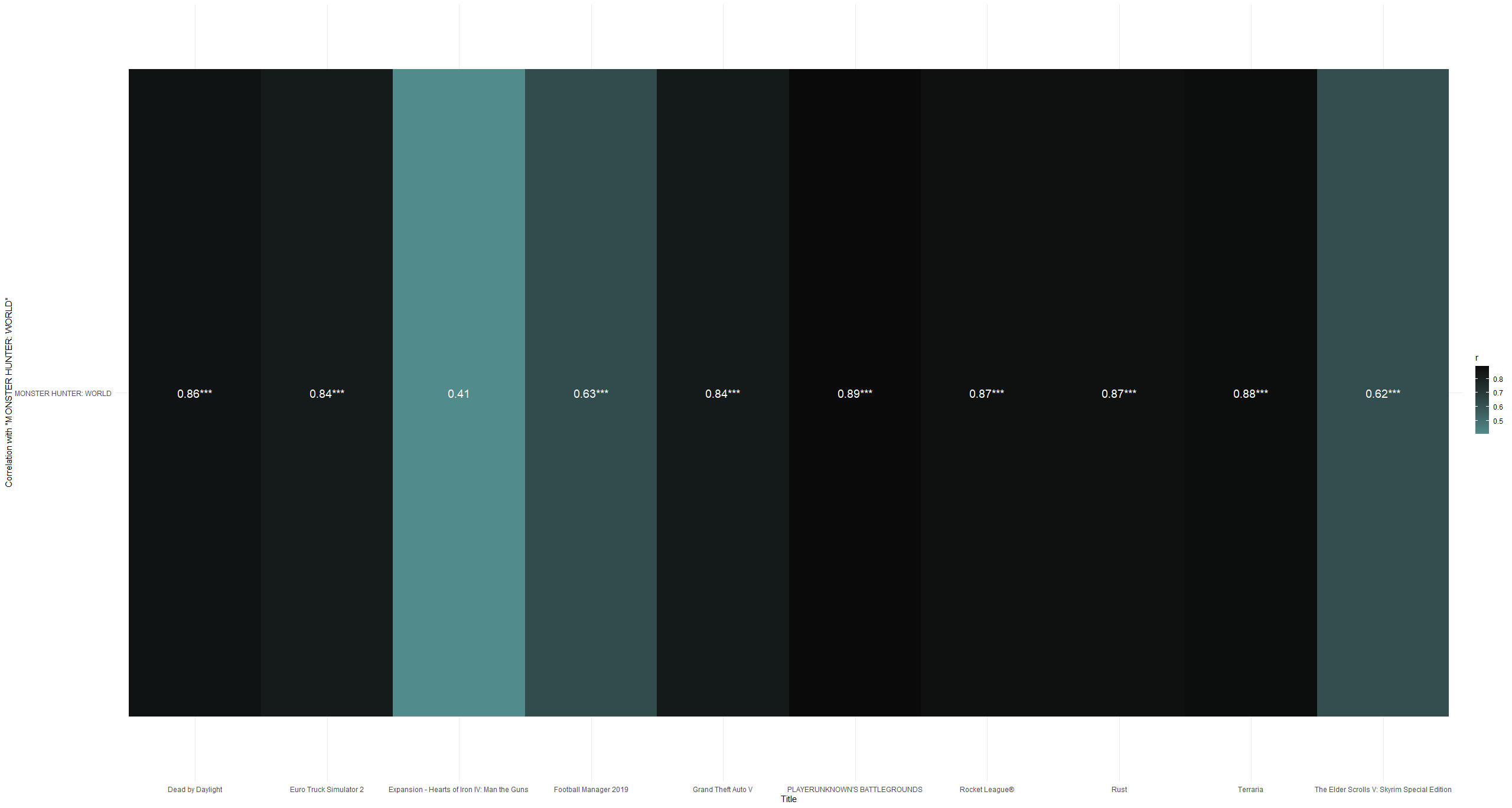 んでその相関係数をプロットしたもの。統計的な有意は全面に出ている。HOI4を除いて。p値はかなり良い具合になってるから(HOI4以外はw)かなり良い値が出ているものと思う。特にFM19とか有意になってて妥当性がある中で相関も低いってのは納得できる。シミュレーションの類のものだから。逆に言うとそのさらに合間にETS2が入っててかつそこから若干近めにTESが配置されているんだよな。まあ先に述べたように段々と近づいていくゲームの境界側面が見えるんだよなこの図からも。