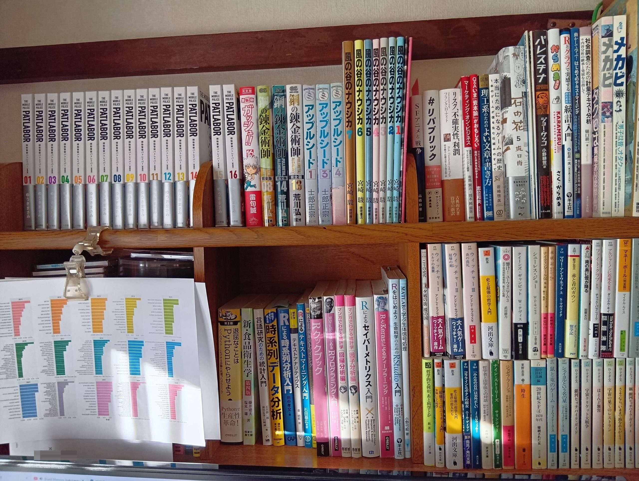 三枚目はデスク周りの本棚(完全に別棚)。大判漫画・お堅い評論本コーナー(上段貫き)。ここには「機動警察パトレイバー」の愛蔵版が入った(今読んでもフツーにおもろい)。「アップルシード」も未来予言した一作として外せない。「鋼の錬金術師」は私の中ではトントンの評価(「金色のガッシュ」もそう)。その右に高橋先生の軍事本とか論文の書き方本が並ぶ(ここにメカビがあるのは内緒だZO)。解析結果を隠れて見えないがCDコーナー(ちなみにここにはいとうかなこ嬢の直筆サイン入りCDがあったりする…どーでもいいけどw)が左下段にある。UI-70のCDとかはマジでお勧めできる。その右隣にR関連のプログラミング本コーナーがある(テキストマイニング本は主)。右下は文庫版傑作小説コーナー。まぁこんなところか。