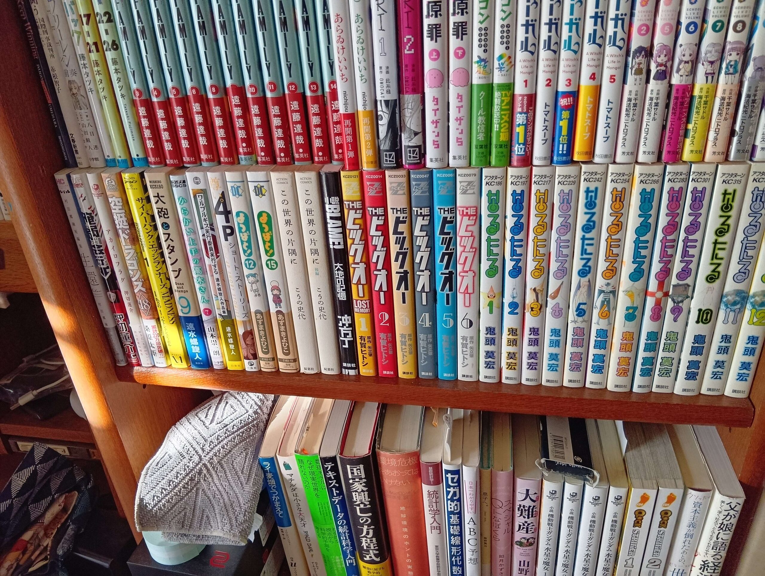 次に二枚目。一枚目の写真の下にこの二段がある。漫画コーナー(上段)&論説書コーナー(下段)。ここは漫画の普通サイズのがいっぱいある。「スパイファミリー」はちょっと飽きてきた。「小林さんちのメイドラゴン」も飽きちゃったので傑作選だけを持ってる。「がっこうぐらし」は神です。「天幕のジャドゥーガル」も歴史ものの傑作。「タコピーの原罪」はオールタイムベスト3に入る。その後ろだがベスト10には間違いなく入る「なるたる」・それと「よつばと」も絶対に外せないね。「日常」はギャグマンガの金字塔。あと「OMORI」はゲームから漫画に行ったブツで亜流な方だね。「国家存亡の方程式」「環境問題をあおってはいけない」「数理モデルはなぜ現実世界を語れないのか」も読まないとな…orz。